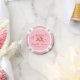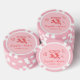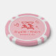 Trendy pink poker chips for your bachelorette party, bridal shower and wedding reception featuring red whimsical hand-drawn illustrations of a heart, stars and wine glasses and the names of the bride and groom in a playful red script.