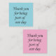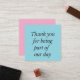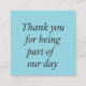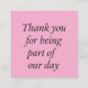 Una tarjeta de agradecimiento boda, muy simple, que incluye la frase "Gracias por ser parte de nuestro día" en un elegante tipo de letra cursiva negra con un suave fondo blanco. Perfecto para expresar gratitud a invitados y seres queridos.