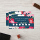 Bonito y moda de impresión floral de color rojo y blanco, con follaje verde y una tarjeta de fidelización de la empresa de fondo azul oscuro.