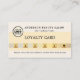 Tarjeta de presentación de fidelidad con su propio logotipo en un elegante diseño de fondo dorado amarillo. Se puede usar una fila de números de oro metálico para realizar las visitas de su cliente. En la parte posterior hay una plantilla de código QR opcional y fácil de personalizar. Una gran tarjeta de visita para un salón de belleza y otros negocios.