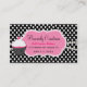 Tarjeta de visita bonita de la panadería hecha en un modelo de lunar blanco y negro, con un área de texto blanca decorativa del rosa del borde, en el frente. Los gráficos de la diversión de la magdalena rosada, blanca, y negra adornan el lado izquierdo, de la tarjeta. La parte posterior de la tarjeta tiene texto adicional, con área del sello de la lealtad del cliente. El texto es completamente adaptable adaptarse a sus necesidades del negocio. Grande para en casa los panaderos también.