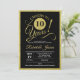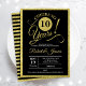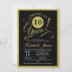Invitación para una fiesta de aniversario de bodas de 10 años en dorado y negro con brillo falso. Tarjeta de invitación impresa con tipografía elegante y fuente de escritura y rayas en la parte posterior. ¡Salud por 10 años! Puede ser personalizada para cualquier año de aniversario. Perfecta para una celebración de aniversario de 10 años con estilo.