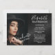 Ya sea que esté celebrando su graduación de la escuela secundaria o graduándose con una licenciatura de una universidad importante, este anuncio de foto de polvo de estrellas negro elegante y moderno y la invitación a la fiesta seguramente impresionarán a sus destinatarios. Simplemente reemplace la foto y el texto de la plantilla con sus datos únicos, agregue al carrito y listo. Tenga en cuenta que se ha aplicado un filtro de foto en blanco y negro a la foto que aparecerá en su foto de reemplazo; esto se puede eliminar haciendo clic en "Personalizar" y haciendo clic en su imagen y seleccionando la opción "filtro" y cambiando el filtro a "Ninguno". Diseño original de Holiday Hearts Designs (todos los derechos reservados).