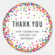 Partido de cumpleaños Rainbow Gracias Pegatinas con texto personalizado y confetti colorido alrededor del borde