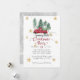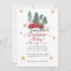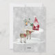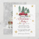 "Tarjeta de vacaciones de la Fiesta de Navidad de la Granja de Gnomo Camión Rojo." Ilustración de acuarela de un camión rojo vintage en la granja de árboles de los gnomos con estrellas doradas y copos de nieve te invitan a una Fiesta de Navidad. Un par de renos y otro gnomo están en el reverso junto con un fondo gris suave con patrón de copos de nieve que caen. Arte de Audrey Jeanne Roberts, derechos de autor.