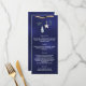 Fondo azul marino, madera marrón y decoración navideña azul y blanca. El color de fondo azul es desigual. Estrellas azules y blancas, y una mujer gnomo azul. Personalice y agregue su menú.