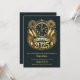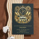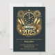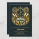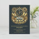 Fiesta de Invitación de Año Nuevo Electrónico Personalizado NYE 2025. Invitación móvil digital en colores negros y dorados con fuegos artificiales, campaña y Ilustracion de reloj de pared de clic.