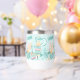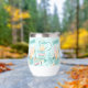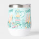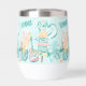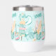 Tumbler de vino temático de verano festivo con un diseño de acuarela de verano tropical con temática de fiesta. El diseño presenta una estética acuática pastel con un fondo azul claro y ilustraciones relacionados con la playa. Frases como "Disfruta tu verano" con elegantes letras a mano, dos tablas de surf, una con la palabra "Aloha" escrita en ella, coloridas carteles de madera apuntando en diferentes direcciones, con palabras como "Beach", "Surf", "Bar" y "Sea" escritas en ellas. Bebé tropical en una concha de coco con paja y adornado con una rebanada de flores y cítricos. Una guitarra acústica gradiente rosa y naranja. Palmeras, hojas tropicales y flores aportan un toque de color a la playa. Un gran regalo para una ducha de novias de verano o una fiesta de soltera o para su próxima hora feliz en su patio trasero.