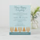 Diseñe estas invitaciones para la fiesta de Chrismukkah con sus detalles de evento en este diseño interconfesional moderno y simple de Menorás de Hanukkah y árboles de Navidad de falso oro con fuentes mixtas en azul oscuro sobre un fondo azul pastel suave. Todo el texto en estas invitaciones personalizadas de oro y azul se puede editar y personalizar para que pueda cambiar FIESTA DE CHRISMUKKAH por CENA NAVIDEÑA o lo que sea que celebre. Una fila de tres Menorás de falso oro y árboles de estilo moderno en la parte inferior resaltan un borde azul profundo con texto blanco "Mientras celebramos el Hanukkah y la Navidad juntos" que puede personalizar con el texto de su fiesta o eliminar por completo si lo prefiere.