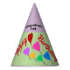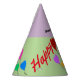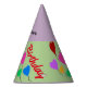 gorras de la fiesta de cumpleaños de globo de bonito. Celebra un primer cumpleaños o cualquier edad con estos festivos globos voladores de corazón en rojo, rosa, azul, lavanda morado, amarillo, verde con el aspecto de rociar alrededor de globos. Personaliza con tu nombre y edad. Con la redacción, Nombre, Edad, Feliz Cumpleaños. Se muestra con un fondo morado claro de dos tonos y verde claro. Gorras de celebración de cumpleaños divertidos para niños o adultos. Diseño original de ilustraciones gráficas © 2013, 2016 TamiraZDesigns.