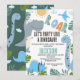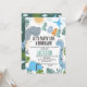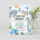 Fiesta moderno de los dinosaurios roares Invitación de primer cumpleaños con el tema de los dinosaurios dulces de primer cumpleaños que puede ser editado para adaptarse a cualquier edad con una palabra decorativa ruar, varios adorables dinosaurios en azul y gris, un sol y follaje. Ideal para cualquiera que busque una invitación simple y moderna para el cumpleaños de los dinosaurios.