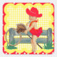Niñita de vaquera sobre un caballo de palo con fondo de cheque amarillo y guarnecido rojo. Este diseño está disponible en más suministros de fiesta.