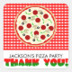 Nuestro Fiesta de pizza ¡Gracias a los pegatinas harán que todos tengan hambre de pizza! El diseño incluye las palabras "¡Gracias!" en rojo y verde junto a un mantel de cuadros rojos y blancos y una gran pizza suprema.