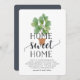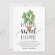 Invite a sus amigos y familiares a su nuevo hogar con nuestras encantadoras invitaciones para fiestas, que incluyen un ilustracion de planta de higos de hojas de hilo de color verde vivo con "hogar dulce hogar" en escritura negra suave y tipografía en bloques. Utilice los campos de plantilla para agregar la información de personalizado, la información de mangueras y los detalles del fiesta.
