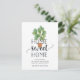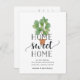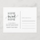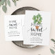 Las encantadoras y modernas tarjetas postales de invitación permiten a amigos y familiares conocer su nuevo hogar dulce hogar! El diseño presenta un vibrante ilustracion de planta de higuera de color verde agua con hilo foliar con "hogar dulce hogar" en escritura blanda negra y tipografía de bloques. Utilice los campos de plantilla para agregar la introducción del personalizado, la nueva dirección y los nombres. La información se repite al revés, con espacio para la dirección del destinatario.