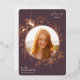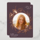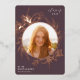 Un elegante diseño de invitación de graduación con una foto de tu graduado rodeado por un borde floral de alirios de Relieve metalizado de oro rosa y follaje sobre un rico fondo violeta. Personalice con el nombre de su graduado, escuela y año de graduación. Añade un mensaje personal a la parte posterior, junto con una foto adicional.