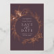Un diseño elegante para guardar la fecha con los detalles de su boda en letras en moda blanquecinas, rodeado por un borde floral de azulejos de Relieve metalizado de oro rosa y follaje sobre un fondo violeta profundo.