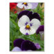 Una fotografía digital linda que ofrece una fila vertical de cuatro pensamientos, cada un diversos tono y sombra de la púrpura con un pedazo del geranio rojo borroso en el fondo.