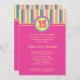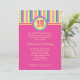 Moderna y colorida invitación para fiestas de 15 años. Ideal para un chica divertido y optimista. Cuenta con un número 15 en un círculo con rayas en la parte superior y un fondo sólido. Diseño joven y moderno.