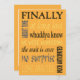 Finalmente nos casamos anuncio divertido de boda o invitación a fiesta con frases graciosas: por fin, al fin, la espera ha terminado, tan esperado, etc. Su texto personalizado al otro lado. Si la gente ha estado esperando por siempre a que se casen y se escaparon o tuvieron una boda en destino o una ceremonia en el juzgado y están lanzando una fiesta de celebración de matrimonio casual más tarde, personalice esta divertida invitación no tradicional para su evento posterior a la boda. O edite el texto para que sea un anuncio de su unión tan esperada.