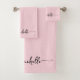 Elegante Chic Moderno Conjunto de Toallas de Baño Personalizadas con Monograma de Nombre en Script de Firma de Color Rosa Claro. Este delicado diseño presenta un nombre personalizado en una fuente de letra cursiva con cola florida (o tipografía) en negro sobre fondo de color rosa claro o rosa bebé. Un regalo femenino y elegante para estrenar casa, también ideal para cumpleaños, despedida de soltera, boda, fiesta de cumpleaños de dulces 16, fiesta de soltera, día de la madre, regalo de aniversario y para fiesta de graduación. Es para la chica que le gustan las cosas elegantes y con estilo.