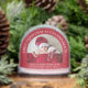 A red keepsake Christmas snow globe for new grandparents to celebrate their newborn grandchild featuring two arch photos and "First Christmas As Grandparents" and the baby's name and birth stats in elegant white serif typography.