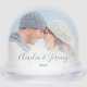 Commemorate your engagement with this beautiful modern keepsake snow globe. The text of Side 1 reads "Our first Christmas engaged," with the word "engaged" in elegant dusty blue handwriting script with flourishes before and after. On Side 2, add your names in the same dusty blue calligraphy script, with the year below in sans serif font. Replace the two sample images with your favorite photos. A white gradient filter helps make the text pop.