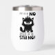 A funny, sarcastic black-and-white graphic design showcases a black cat with frazzled fur and a scowling expression. The black handwritten text says, "First of all, no. Second of all, still no!" Available on a wide variety of products, this design makes a perfect gift for cat lovers.
