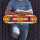 Skateboard with design with a flag of historic county of Westmorland, in England, Great Britain; white and red striped flag with golden heraldic apple tree in the center