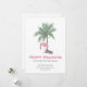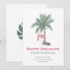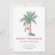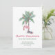 Flamenco de Navidad con sombrero de Santa junto a una palmera decorada. Felices Fiestas desde nuestra nueva casa para las fiestas. La plantilla está configurada para que puedas agregar los detalles de tu nueva dirección y mantenerte en contacto con amigos y familiares durante la temporada navideña .