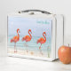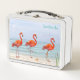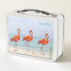 Hermosos flamencos de coral rosa en la playa. Texto del nombre listo para ser personalizado.