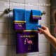 Personaliza la textura moderna y romántica del denim con fondo morado.y una imagen de un flamenco rosado parado con corbata de arco rojo