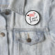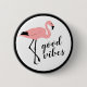Un botón divertido con flamingo y el lema Buenas vibraciones. Negro y rosa coral. Tipografía de escritura moderna.