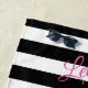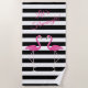 Esta toalla tropical rayada en blanco y negro de la playa se acentúa con dos lindos flamencos rosados. Let's Flamingle, escrito en rosa claro, es perfecto para tu próximo fiesta de piscina o para el día en la playa.