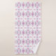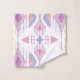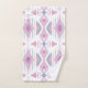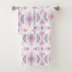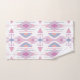 Este juego de toallas de baño presenta un patrón tribal geométrico de flechas y diamantes en melocotón pastel, azul, rosa y frambuesa sobre blanco para un aspecto boho.