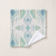 Este juego de toallas de baño presenta un patrón tribal geométrico de flechas y diamantes en vidrio marino, salvia, azul y crema para un aspecto boho.