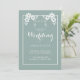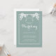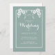 Invitación a una boda en color azul pizarra con texto blanco y acentos florales en la parte superior de la delgada frontera. Los colores y el texto son completamente editables en línea con unos pocos clics pero si necesita ayuda, póngase en contacto con el diseñador en ArtByLiz@gmx.com y la tarjeta se personalizará para usted sin cargo adicional.