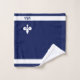 Elegante Fleur de Lis blanco sobre azul marino con texto editable sobre un juego de toallas de baño de rayas blancas. Toallas elegantes. La imagen se puede personalizar.