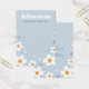 Tarjeta de visualización de joyería de diseño con flor de fresa blanca sobre un fondo azul polvoriento y nombre de empresa o diseño en un tipo de letra retro.