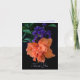 Estas dramáticas tarjetas de notas presentan un primer plano de una vistosa flor de Hibisco naranja brillante y flores moradas y hojas verdes. Esta vibrante floral tropical se muestra sobre un fondo negro que añade a su impresionante belleza. Estas elegantes tarjetas de notas de fotografía botánica pueden ser utilizadas para notas de agradecimiento o el texto frontal "Gracias" puede ser fácilmente cambiado o eliminado. Las tarjetas están en blanco por dentro, pero se puede agregar su texto.