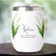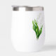 Con un ilustracion de flores de lirio del valle. Debajo de las flores, el nombre está escrito en una elegante fuente de escritura. Debajo del nombre, dice "Mayo - Lily del Valle", indicando que su mes de nacimiento es mayo y su flor de nacimiento es la liga del valle. Es un vaso de vino personalizado, personalizado como un regalo para alguien nacido en mayo.
