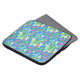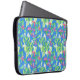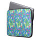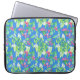 Una manga de bonito para un portátil grande, con un patrón de color blanco cremoso Naranja Mock Blossom y Weigelia rosa brillante sobre un fondo azul cielo, a partir de un diseño acuarela pintado a mano por Judy Adamson.