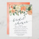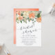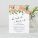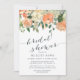 La elegante y moderna invitación a la ducha de novias floridas con flores incluye un ramo de suaves rosas de acuarela pastel, peonías e hidrangeas en tonos melocotón y crema, con hojas botánicas verdes y eucaliptos. Personalice los detalles de su ducha de novia con elegantes letras azules ahumadas acentuadas con caligrafía de estilo manuscrito.