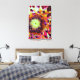 con un original y único diseño de arte de acuarela floral pintura de cerca, macro dahlia flor en exquisito detalle casi 3D. El diseño es de colores vivos con tonos violetas, rosados calientes y amarillos para los amantes del arte botánico o de los colores vivos e intensos.