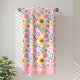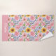 Este diseño de toalla de baño de flores está completo con un bonito patrón continuo de flores rosas, flores azules y girasoles sobre un fondo blanco, así como un lugar para agregar tu nombre.