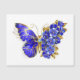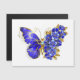Joyería, azul, zafiro, mariposa floral brillante con ala decorada con flores azules y preciosas con hojas de oro sobre fondo blanco.