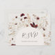 Esta tarjeta postal de respuesta de boda de color beige con flor silvestre de color burdeos de cobre es perfecta para su boda rústica clásica boho de color óxido, blanco y marsala. El diseño presenta una corona o ramo bohemio de flores silvestres modernas de acuarela en color púrpura, rojo, gris y rosa junto con follaje de color naranja quemado y dorado. Las flores representadas en el diseño son amapolas y cebada. El diseño es ideal para una boda de jardín campestre simple y minimalista de otoño o verano de otoño, primavera. Por favor, busque otros artículos de papelería de boda que coincidan o coordinen en el resto de esta colección.