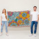 Luminosa, alegre, atrevida, caprichosa, artsy describe mejor esta divertida manta de tiro con grandes flores de naranja, azul y rosa con hojas y viñas verde azuladas.