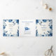 Ceremonia floral azul Chinoiserie flores boda y programa fiesta. Con un bonito diseño chino con flores azules y adornado con delicadas flores de piedra, esta carta se inspira en la porcelana y el arte clásico chino. Los tonos cobalto, índigo y blanco evocan la elegancia de los cuadros de tinta, añadiendo un toque de romanticismo a la celebración. En el centro de la decoración se puede apreciar una fotografía de la pareja, que crea un toque personal. Los nombres de la pareja se muestran con elegancia en la tipografía clásica añadiendo elegancia a la presentación general.