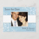 Añada su propia foto a nuestro personalizado Guardar las postales de Date con un elegante diseño floral azul claro. Plantilla fácil de usar: sólo tiene que añadir la foto e introducir los nombres de la novia y de la novia, junto con la fecha del boda en el espacio que se proporciona.